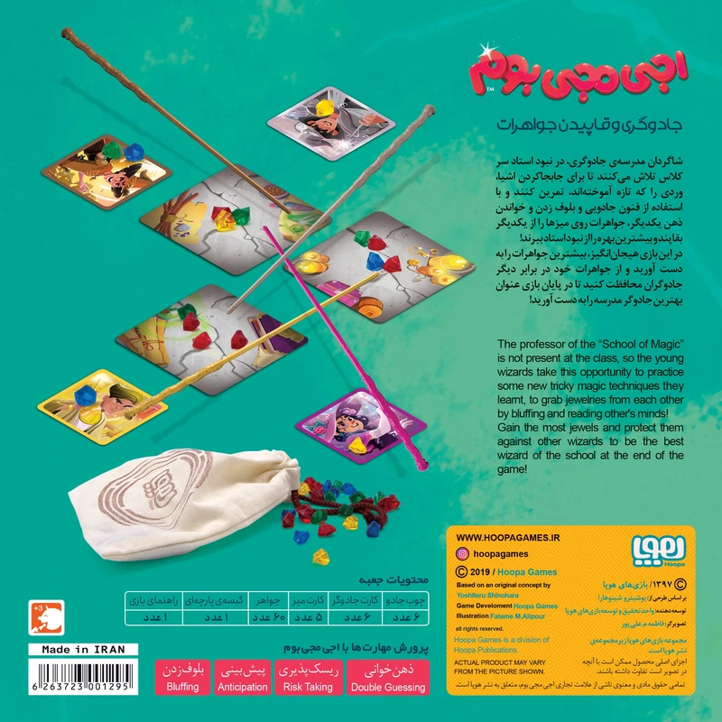 بازی اجی مجی بوم از برند هوپا (Hoopa) یکی از محبوبترین بازیهای کارتی و فکری خانوادگی است که ترکیبی از هیجان، سرعت و خلاقیت را ارائه میدهد. در این بازی، بازیکنان در نقش جادوگران رقابتی ظاهر میشوند و با استفاده از چوبهای جادویی خود سعی میکنند جواهرات رنگارنگ روی میز را به دست آورند.
