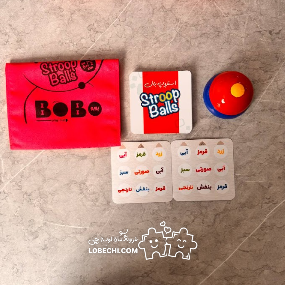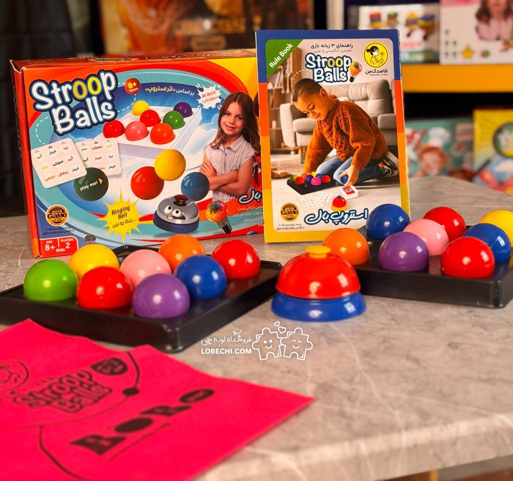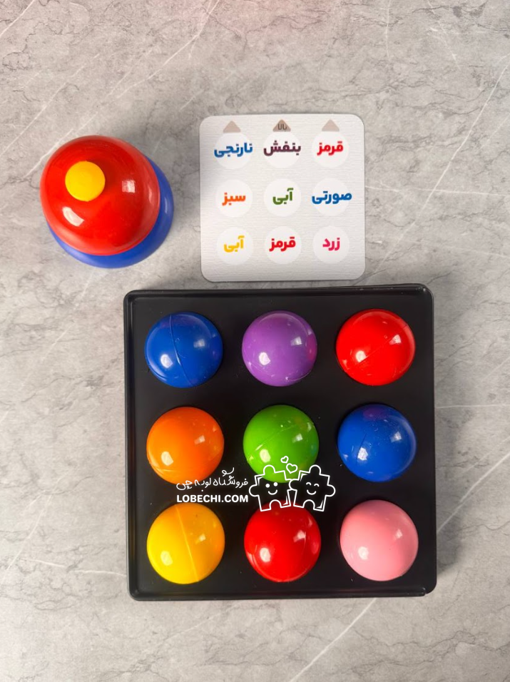 | اقلام همراه | 1 زنگ, 18 عدد توپ رنگی, 2 عدد استند بازی, 24 کارت بازی, دستور بازی |