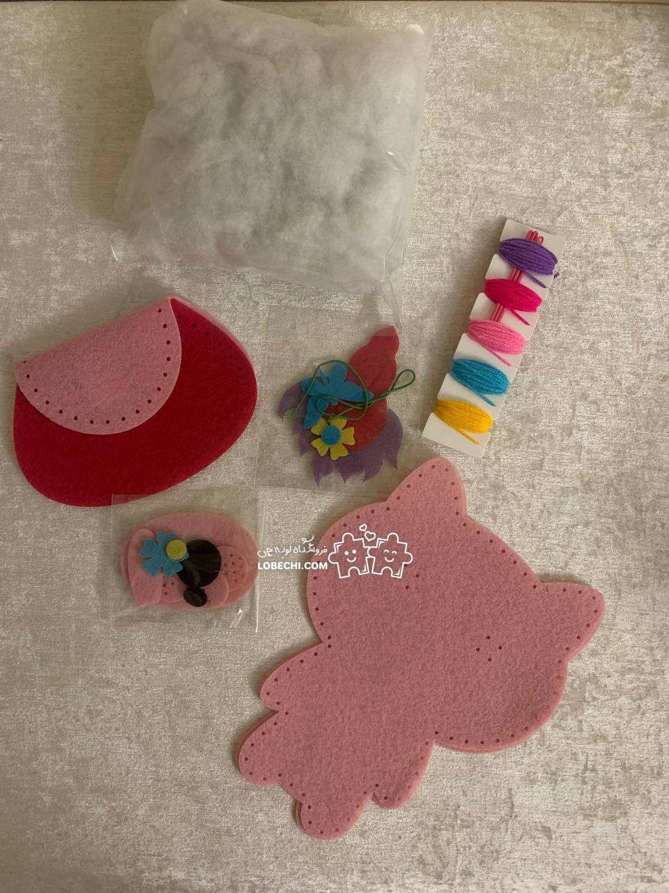 الیاف, چسب مایع, دفترچه راهنما, زیر انداز کوچک, سه تکه مبلمان نمدی, سه تکه میز چوبی, قطعات چهار عروسک نمدی، شامل: خرس، پاندا، سگ و خرگوش, گل و گلدان کوچک شیشه ای, نخ و دو عدد سوزن ایمن