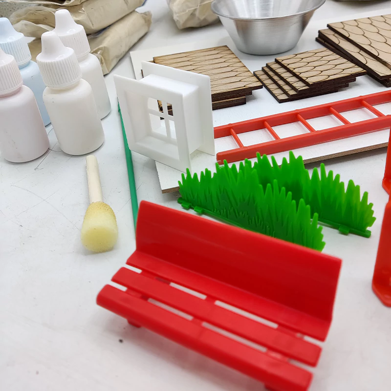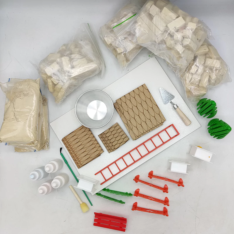 محتویات بازی: ۳۰۰ آجز بامزه شبیه آجرهای واقعی ولی در سایزهای مینیاتوری، ۳ بسته ملات، استامبولی، ۱ عدد کمچه،۱۲ سقف در سه سایز مختلف، درخت، نرده، صندلی، در و پنجره هست.
