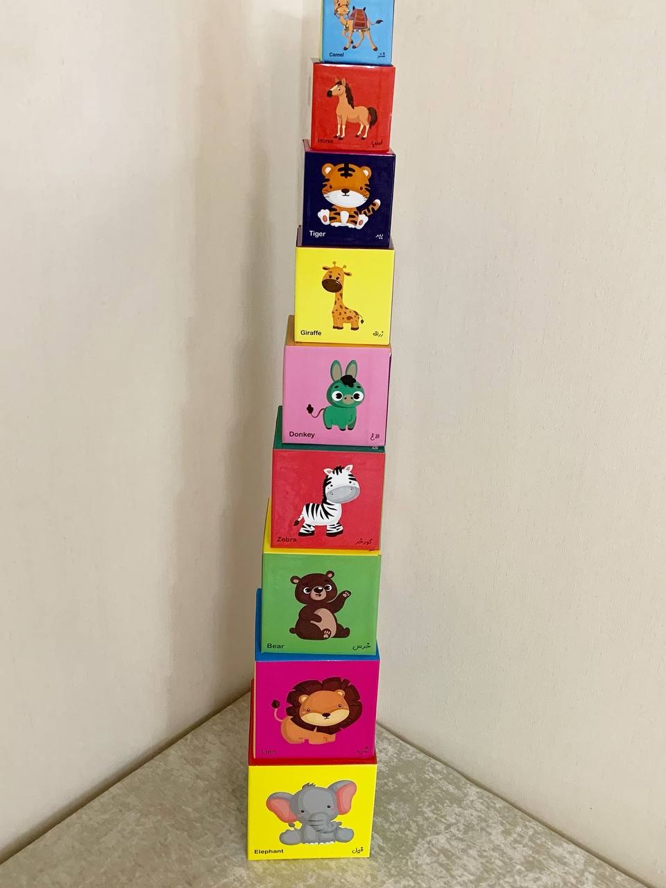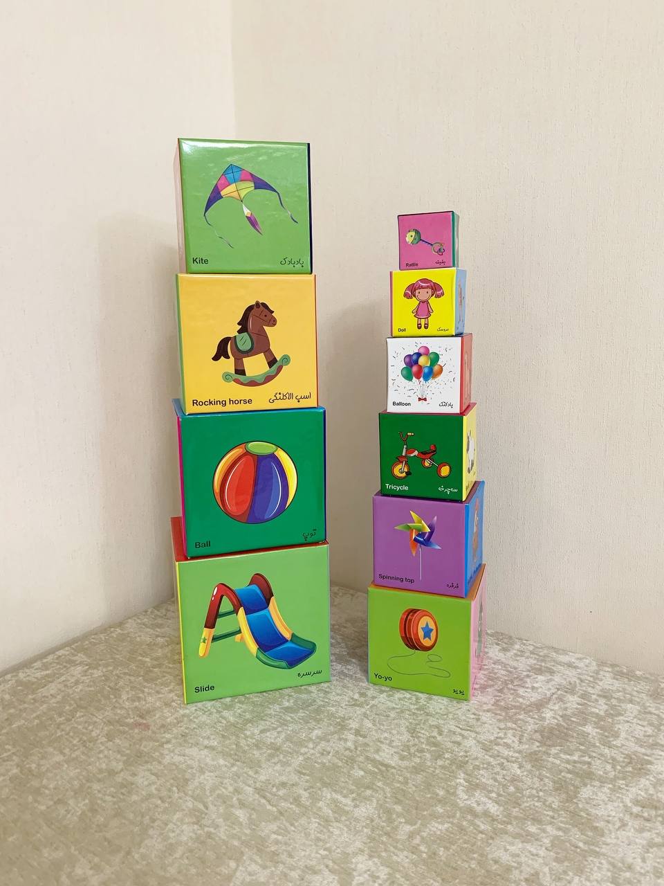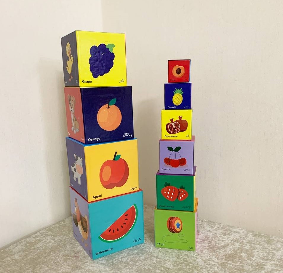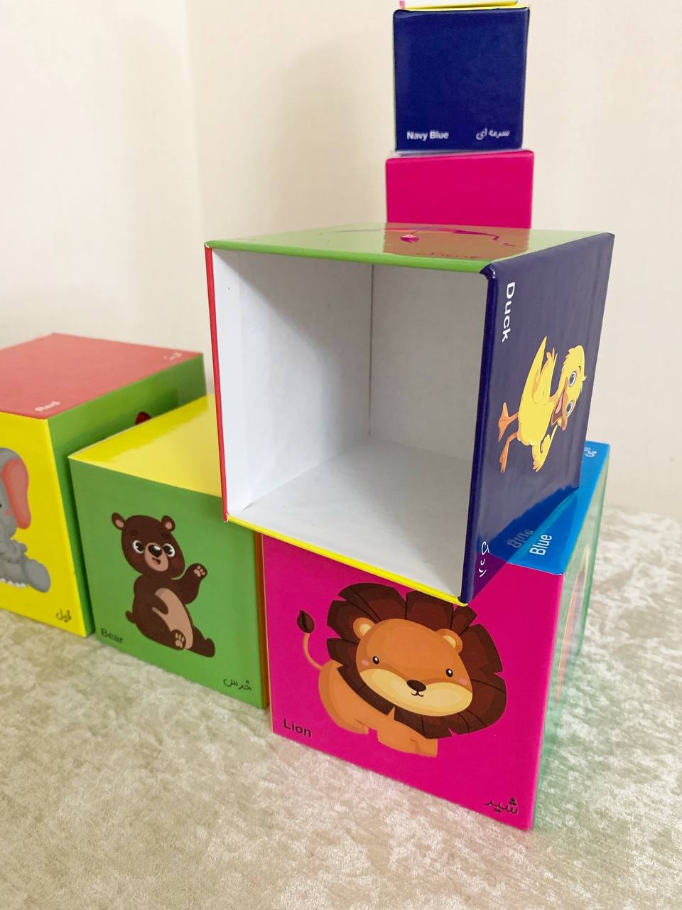 ابن مکعب ها برای کودکان 2 سال ب بالا مناسبه .با این اسباب بازی کودک میتونه مفاهیم ساده و ببینه و خیلی زود یاد بگیره.جنس بازی برج مکعب مقوای ضخیمه و براحتی خراب نمیشه.
