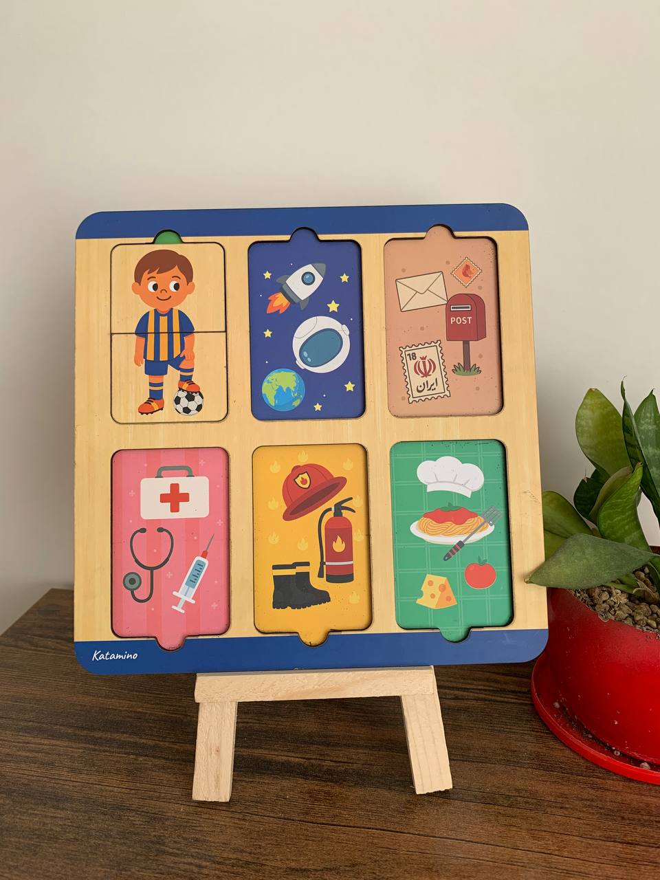 پازل چوبی مشاغل از برند قندون, 6 تا شغل مختلف رو به همراه وسایل مورد نیاز برای هر شغل به کودک آموزش میده.